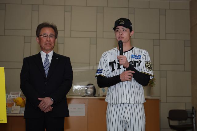 兵庫県庁にお招きいただき有難うございます。粟井社長もおっしゃったように、90周年の節目の年で、なんとかチームとしてもリーグ優勝を絶対に成し遂げたいという思いで今年1年戦ってきましたし、個人としても昨年の悔しさがすごくあったので、なんとか今年はやり返してやろうという気持ちで臨みました。その結果、史上最速のリーグ優勝ということで、本当に県民の皆様にたくさん応援していただいて、勇気や希望を少しでも与えられたんじゃないかなと思っています。来シーズン連覇することによって、もっともっと勇気や希望を与えられると思いますし、小さい子供たちにも夢を与えられると思うので、そこを目指して、愛される球団であり続けるために、シーズン連覇目指して頑張っていきたいと思います。引き続き応援よろしくお願いします。