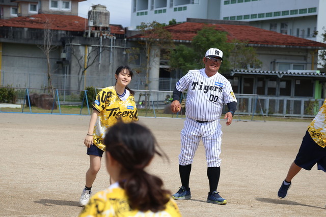 16日(月)、阪神タイガースOBの亀山努氏と秋山拓巳ベースボールアンバサダーが、キャンプ地の沖縄県宜野座村立「松田小学校」とうるま市立「宮森小学校」を訪問し、ゲストティーチャーとして投球、捕球の仕方や、実践型ベースボールゲームなどで楽しい時間を過ごしました。