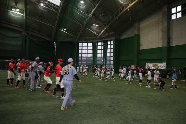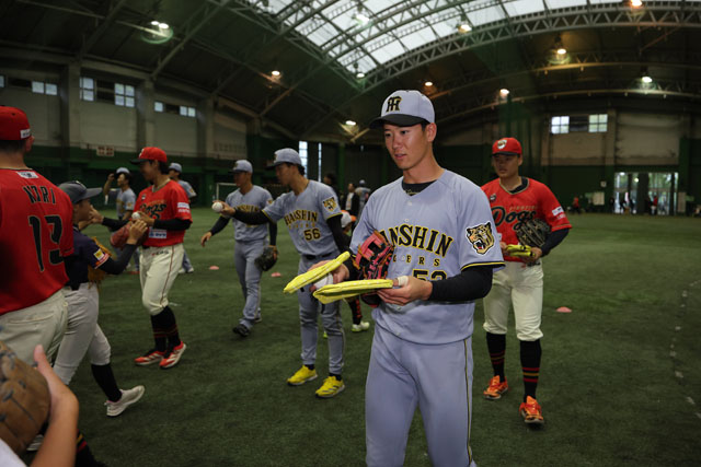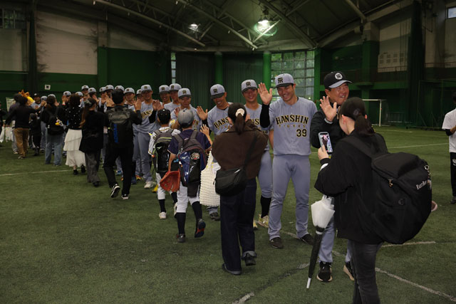室内練習場では、練習見学会や地元・高知県の少年少女野球チームとタイガース・ファイティングドッグスの選手によるキャッチボールクラシック、ミート&グリート、サインボールプレゼント、そしてハイタッチ会が行われ、雨天にもかかわらずご来場いただいた全国のファンの皆さまとメモリアルな時間を過ごしました。